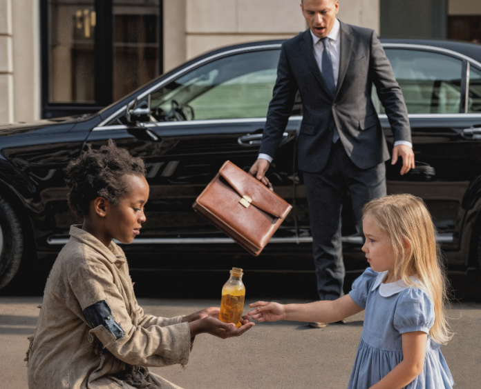 De l’autre côté de la place, une fillette d’à peu près son âge. La peau sombre luisante de chaleur, des vêtements élimés, les pieds nus poudrés de poussière. Entre ses doigts, un petit flacon en verre où vibrait un liquide doré et épais. La pauvreté n’avait pas éteint ses yeux : une lueur de détermination y brûlait, comme si ce bocal contenait un trésor.