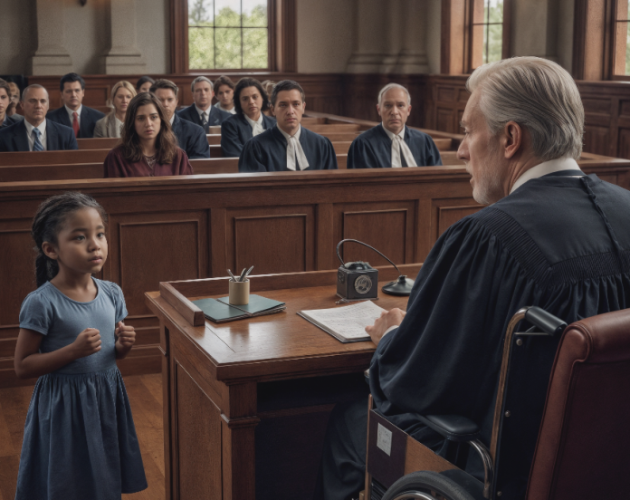 Sur l’estrade, le juge Raymond Callahan, célèbre dans tout l’État pour sa rigueur inflexible, demeurait droit dans son fauteuil roulant. Il n’avait pas posé le pied au sol depuis dix ans — depuis l’accident qui lui avait volé sa femme et sa marche. Nul n’avait jamais entamé son armure.