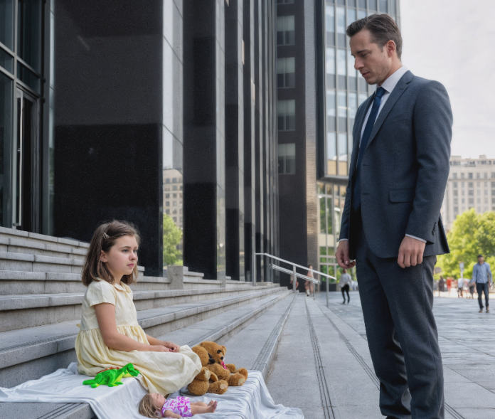 Au bas du gratte-ciel, une fillette était assise. Six ou sept ans tout au plus. Une robe jaune passée, les genoux serrés contre elle, posée sur une couverture bleue étalée bien droite sur les marches glacées. Devant elle, cinq jouets rangés comme à la parade : un ours élimé, un petit dinosaure, une poupée aux cheveux emmêlés, et deux créatures bricolées à la main, difficiles à nommer.