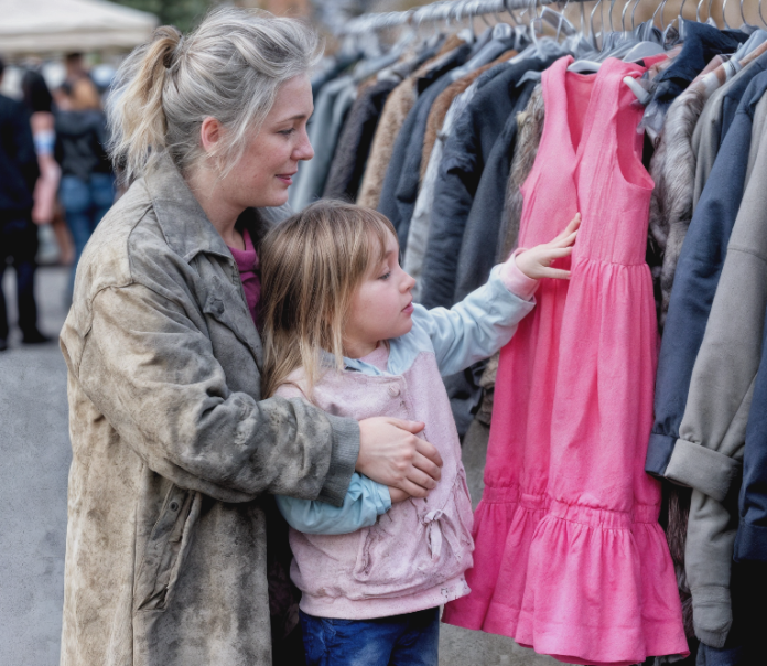 Une grand-mère et une fillette d’environ cinq ans. Le manteau trop fin pour le froid, des baskets dont l’avant baillait. La petite ne lâchait pas la main de sa grand-mère mais ses yeux s’illuminaient devant un portant de vêtements.