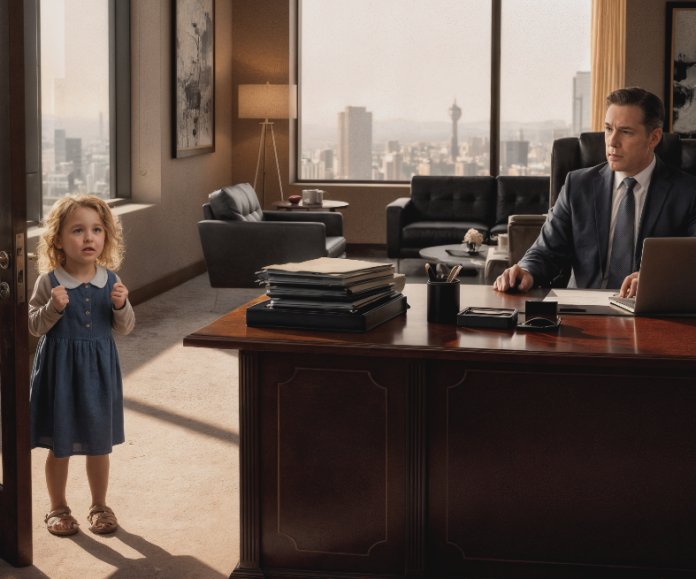 La voix venait d’une fillette de quatre ans, plantée dans l’embrasure du bureau le plus prestigieux de la ville. Ses petits chaussons roses tapaient nerveusement le marbre, et ses doigts froissaient l’ourlet de sa robe bleu passé.