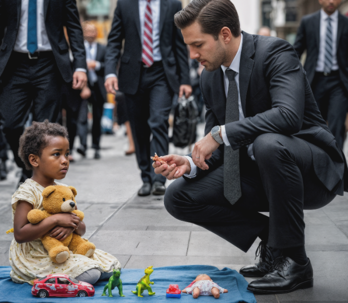 Sur la dernière marche, une fillette assise en tailleur sur une couverture mince alignait cinq trésors de fortune: un ours en peluche usé avec un œil manquant, une poupée rose ternie, un dinosaure vert un peu branlant, une petite voiture rouge écaillée, et un lapin cousu à la main dont la couture tirait au cou. Des morceaux de papier scotchés indiquaient des prix bancals, d’une écriture d’enfant: 50 cts, 75 cts, 1 $.