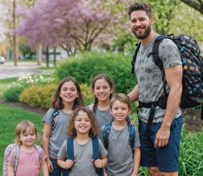 Un samedi, le soleil plaque des carrés de lumière sur le perron. James porte un short cargo et un t-shirt dinosaure — caprice adopté pour faire plaisir aux jumeaux —, une barbe poivre et sel, des bras devenus forts à force de sacs, de cartables et d’enfants endormis. Devant la maison, la fratrie pose pour la photo rituelle de la randonnée de printemps : Lily (16 ans), déterminée, badges de physique au sac ; Zoe (14 ans), l’air doux, des taches de peinture incrustées aux doigts ; Mason et Mia (10 ans), les fameux inséparables ; et Emma, 6 ans, une boule d’énergie que Sarah n’a tenue qu’une seule fois.