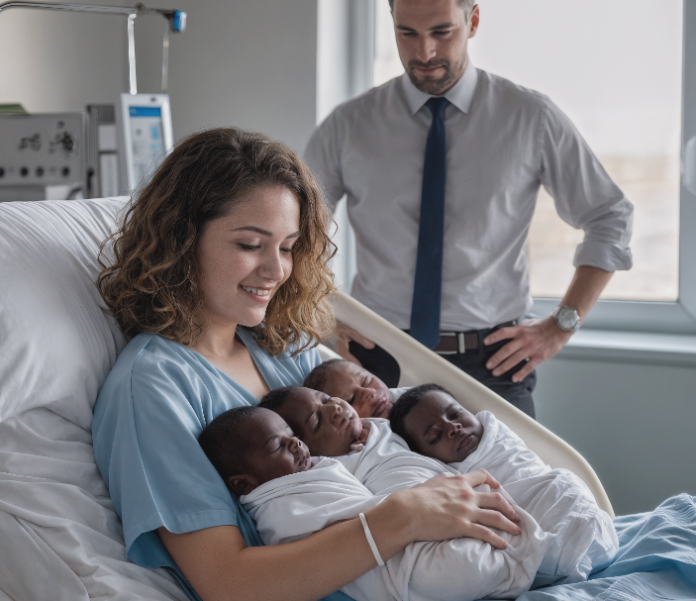 La jeune mère, lessivée mais lumineuse, sourit entre deux larmes en admirant ses quadruplés—minuscules, fragiles, impeccables.