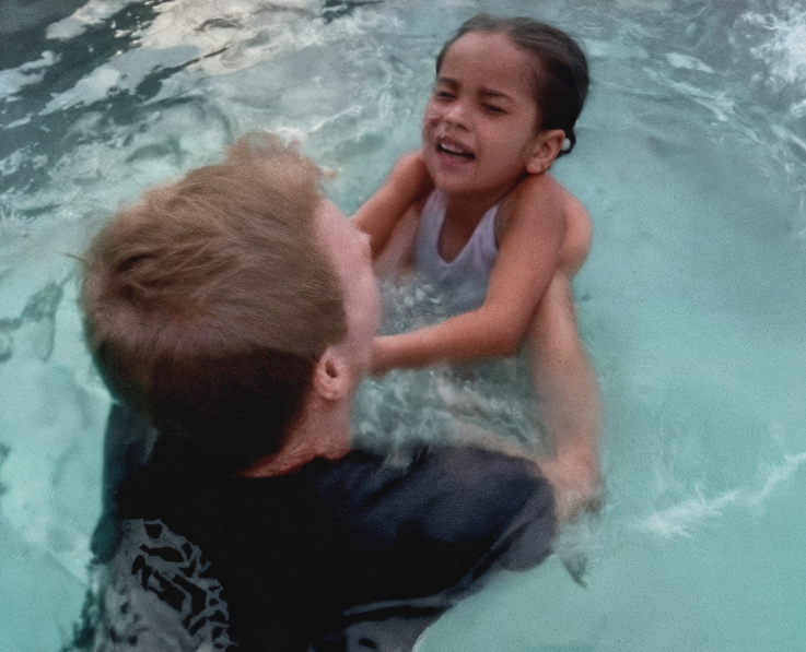 Un temps suspendu. Je ne voyais pas ce qu’il visait, puis l’image s’est nette : une toute petite fille — quatre ans à peine — battant l’eau trop profonde. Ses bras ont frappé une fois, puis plus rien. Mon souffle s’est coupé.