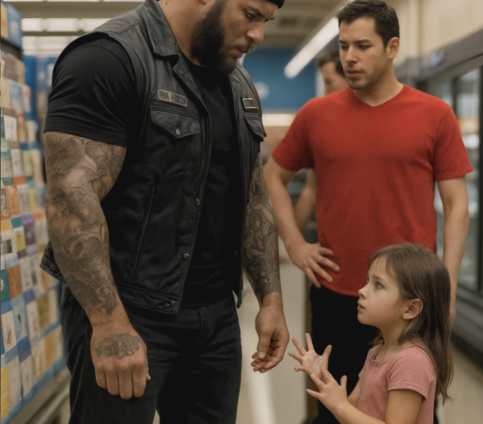 Et là, le visage du motard a changé. L’inquiétude a glissé pour laisser place à une colère noire, brute. Il s’est redressé, a balayé le magasin du regard avec des yeux qui promettaient la guerre, tout en gardant la petite serrée contre lui.