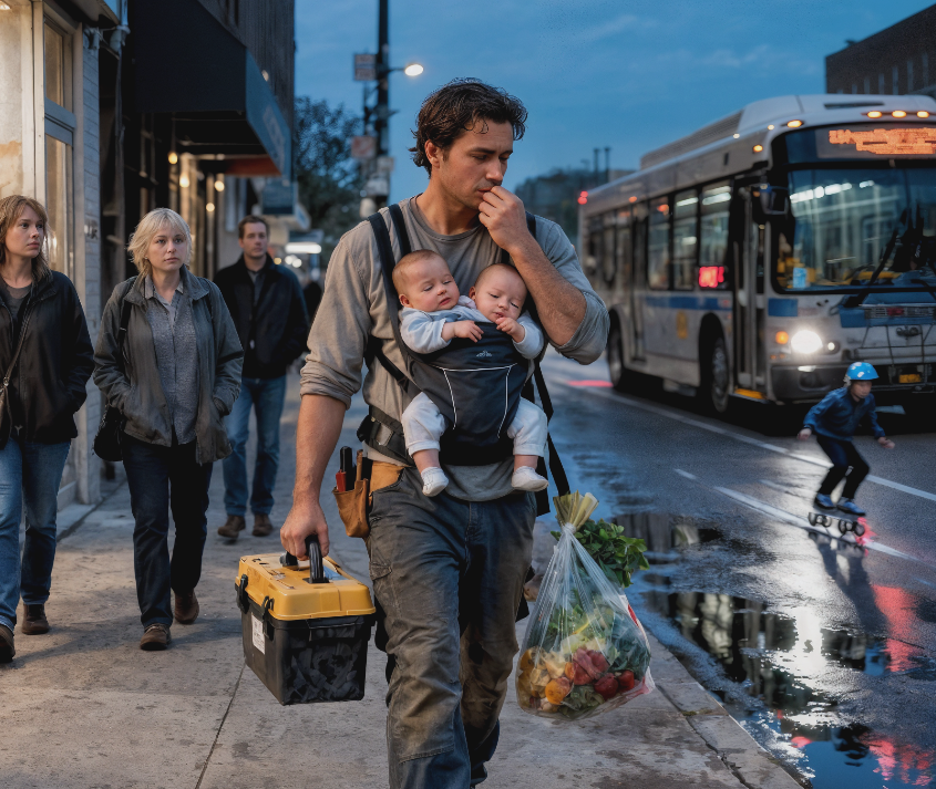 Ce n’était qu’un père vidé par la journée, avançant lentement sur le trottoir. Dans une main, il serrait sa vieille boîte à outils ; dans l’autre, les sacs de courses qui lui coupaient les doigts. Contre son torse, attachés dans un porte-bébé, deux tout-petits dormaient paisiblement. Leur mère était partie sans un mot, et depuis, il faisait de son mieux pour tout porter — le poids du quotidien, et celui de ses enfants.