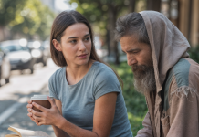 Il se contenta de baisser les yeux, de ramasser avec soin son sac éventré, de tourner les talons et de s’éloigner — sans un mot.