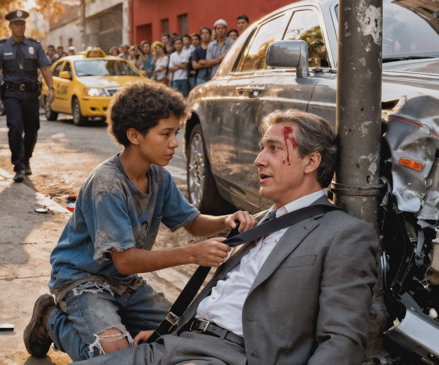 En une seconde, tout se déroula sous ses yeux : la voiture dérapa, tourna sur elle-même et alla s’écraser contre un poteau avec un fracas terrible. Le pare-brise explosa, projetant des éclats de verre partout. Les passants s’arrêtèrent, figés, certains sortant leur téléphone, d’autres n’osant pas s’approcher. Lucas, lui, n’hésita pas.