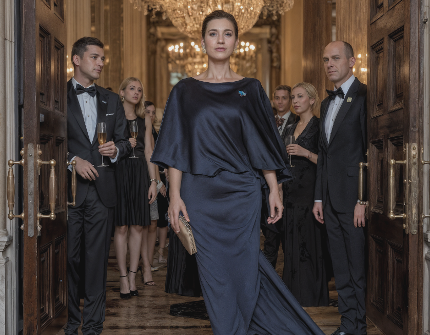 La mère, Veronica, portait une robe vert émeraude étincelante, moulante, chargée de paillettes. Bijoux partout : cou, poignets, doigts. Maquillage parfait, chignon travaillé. Une élégance froide, calculée, comme une vitrine de joaillerie.