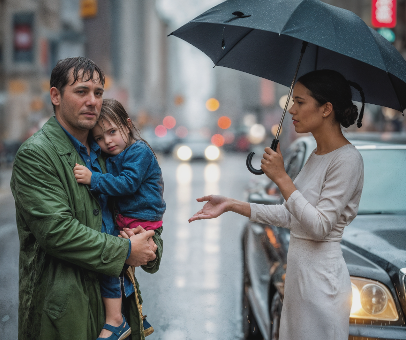Puis une Tesla noire, impeccable, s’est engagée sur le parking. Une femme en est sortie : la trentaine, élégante, maîtrisée, presque intimidante. Son manteau bleu était simple, mais tout dans sa posture respirait l’aisance et l’habitude du luxe. Au lieu de se diriger vers la boutique, elle vint droit vers lui.