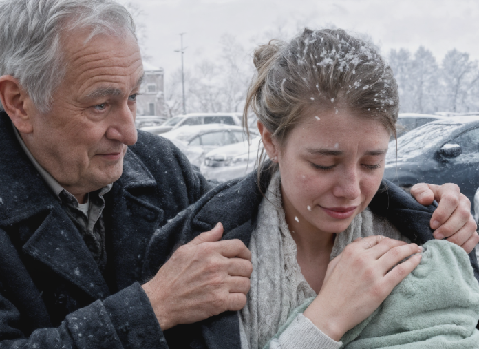 Tout au fond, entre deux voitures, comme si elle cherchait à se faire petite pour ne pas être vue. Une jeune femme — presque une gamine — tenant un bébé contre elle. L’enfant était enveloppé dans ce qui ressemblait à une simple serviette de bain. Et elle… elle n’avait qu’un petit pull mince, celui qu’on met en octobre, pas en plein hiver.