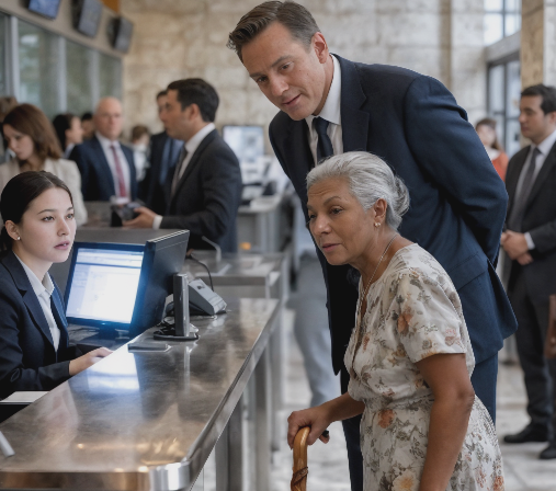 Quand Evelyn arriva enfin au guichet, une jeune employée, Sarah, lui adressa un sourire professionnel.
