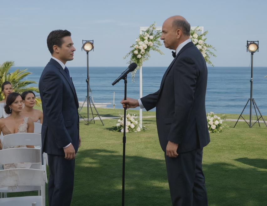 Depuis la fenêtre de l’étage, j’ai observé cinq équipes différentes installer leurs dispositifs. Projecteurs, rails, drones. Ils plaçaient la lumière pour capturer “l’heure dorée” au moment des vœux. Ils ne filmaient pas une union. Ils fabriquaient du contenu.
