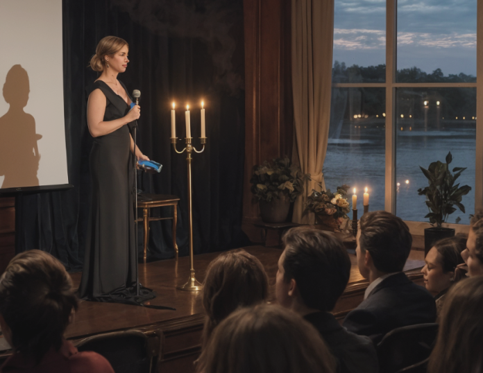 Quand le dîner s’est terminé et que la salle a baigné dans la lumière douce des bougies, Amanda est montée sur scène. Les conversations se sont éteintes.