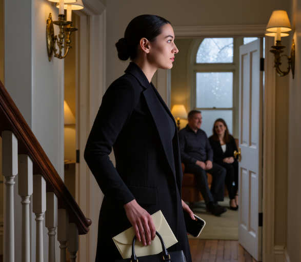 Sarah resta immobile sur le pas de sa propre porte. Sa robe noire de deuil, froissée par le long voyage, collait encore à son corps. Dans sa main tremblante, elle serrait le livret de la cérémonie de son père. La maison avait changé. On aurait dit qu’elle vibrait d’une présence étrangère, d’une tension qui lui rampait sous la peau. Ce n’était pas seulement le silence de la perte — c’était l’électricité de quelque chose qu’on lui avait volé.