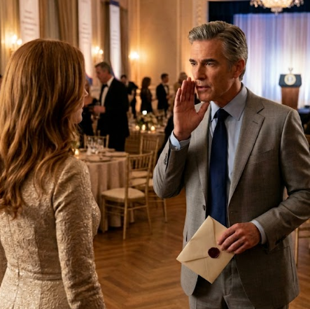 Les applaudissements étaient assourdissants, un mur physique de son qui semblait me repousser davantage dans l’ombre. Mais soudain, l’atmosphère changea. Un inconnu en costume gris, doté de la gravité silencieuse d’un directeur de funérailles, s’approcha droit de ma table. Il plaça une enveloppe scellée à la cire dans mes mains et se pencha tout près.