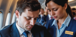 Il traversait l’allée de l’avion, serrant contre lui un bébé tout...