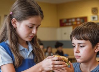 Une fillette offre une partie de son repas à un camarade...