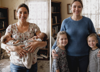 Au petit matin, encore épuisée par la naissance de nos triplés,...